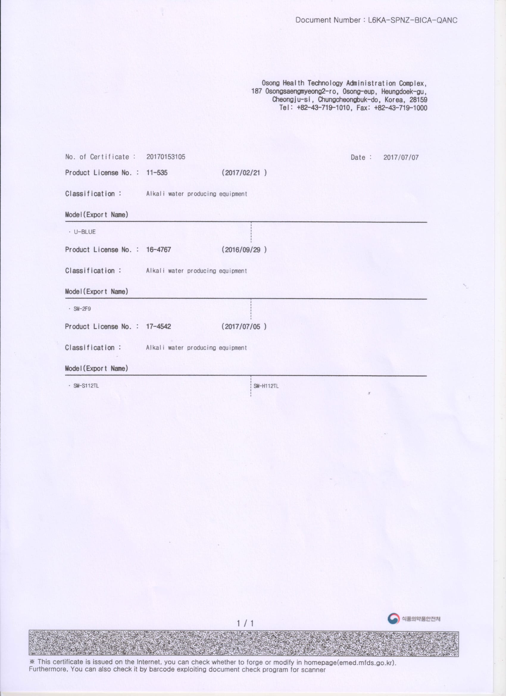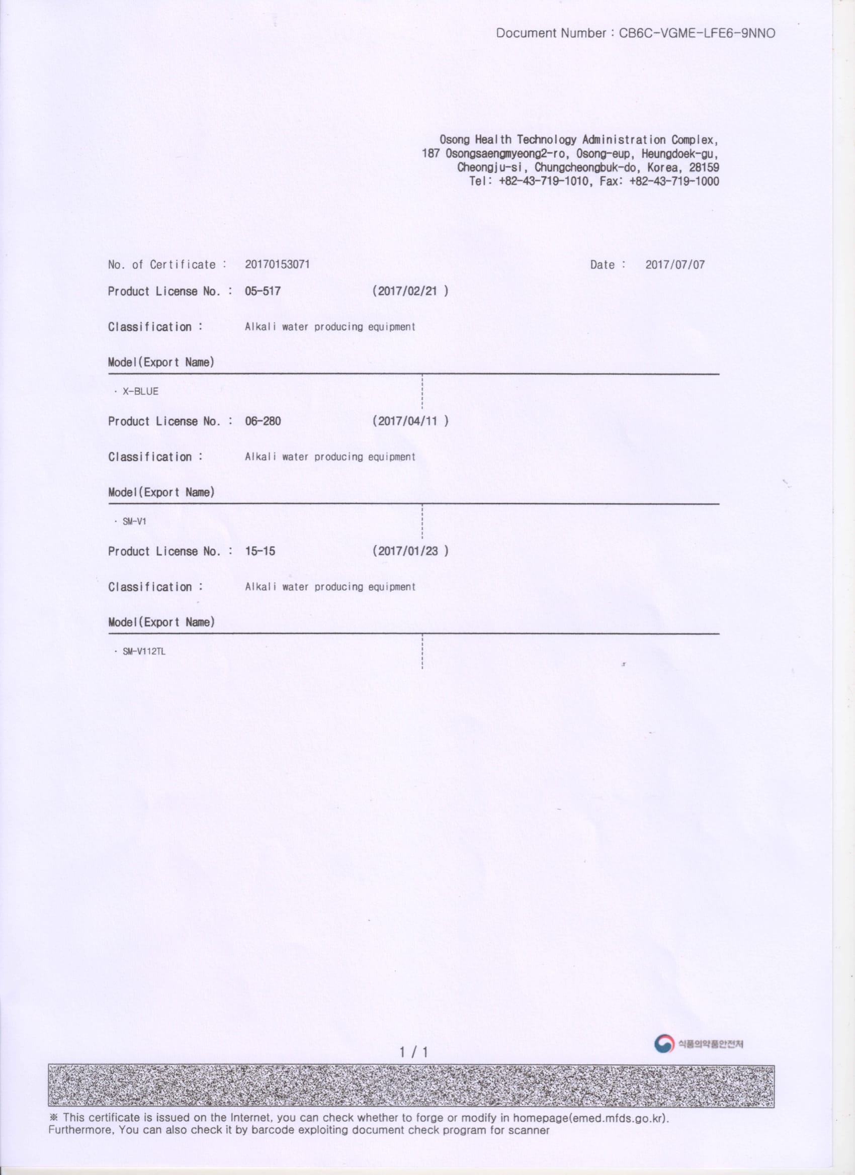 Chứng nhận của Cục an toàn về Dược và Thực phẩm Hàn Quốc