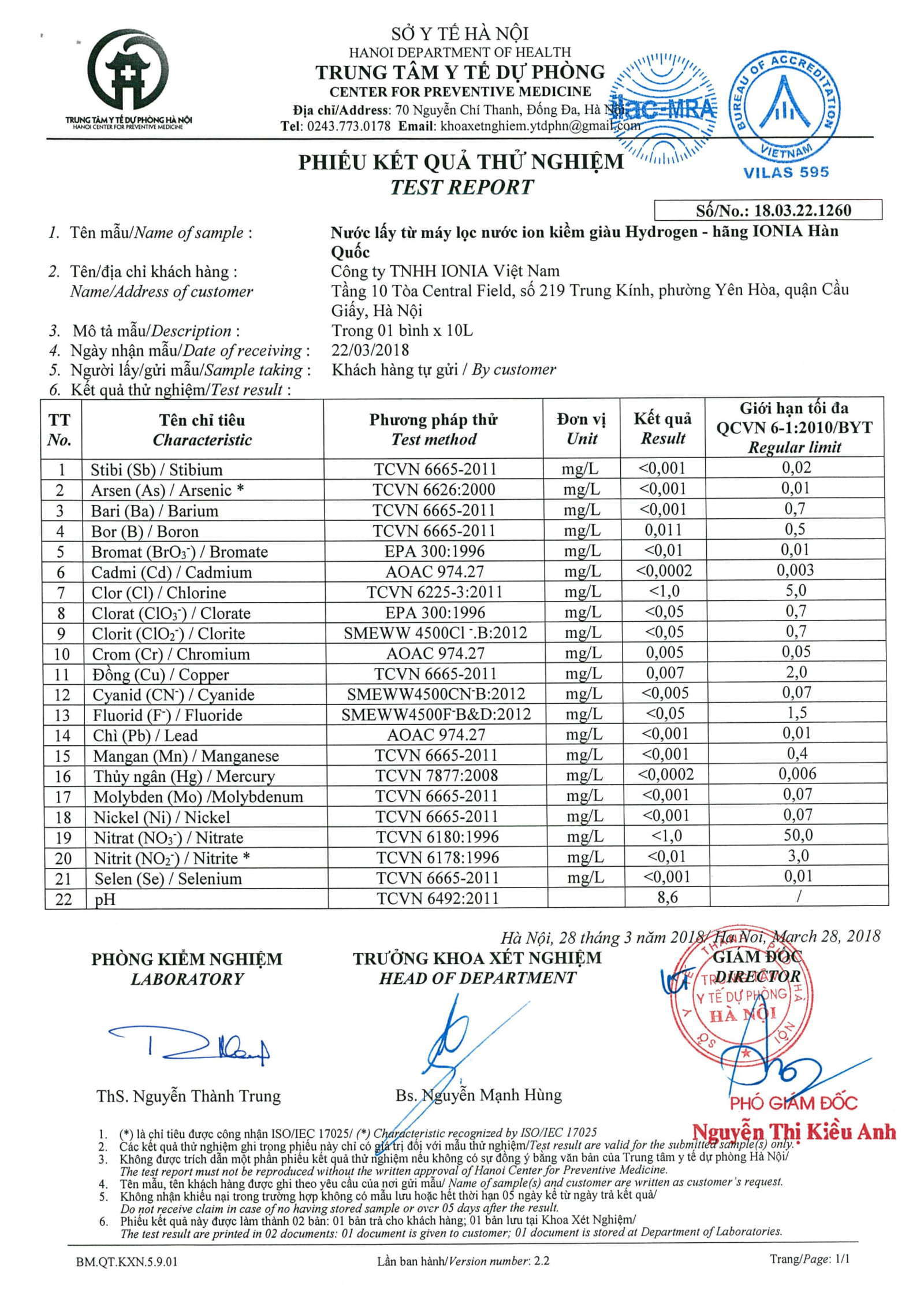 Chứng nhận kiểm nghiệm nước của Sở Y Tế Hà Nội – Trung tâm y tế dự phòng