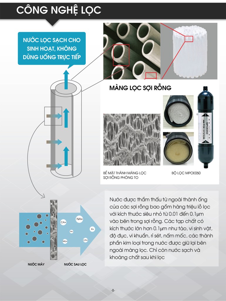 Nước được thẩm thấu từ ngoài thành ống của các sợi rỗng bao gồm hàng triệu lỗ lọc với kích thước siêu nhỏ từ 0,01 đến 0,1 um vào bên trong sợi rỗng. Các tạp chất có kích thước lớn hơn 0,1 um như tảo, vi sinh vật, độ đục, vi khuẩn, rỉ sét, nấm mốc, các thành phần kim loại trong nước được giữ lại bên ngoài màng lọc. Chỉ còn nước sạch và khoáng chất sau khi lọc. |