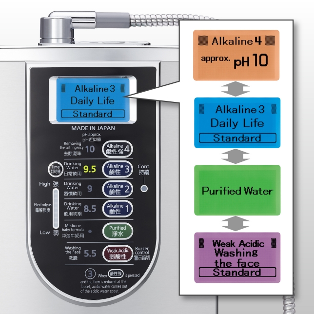 Hiệu quả về cải thiện các triệu chứng đường tiêu hóa của nước ion kiềm đã được phê duyệt theo quy định của Đạo luật về thiết bị y dược Nhật Bản (Đạo luật PMD). Nếu đây là lần đầu tiên uống loại nước này, bạn nên bắt đầu với nước có độ pH 8,5 cho đến khi bạn cảm thấy quen thuộc hơn.