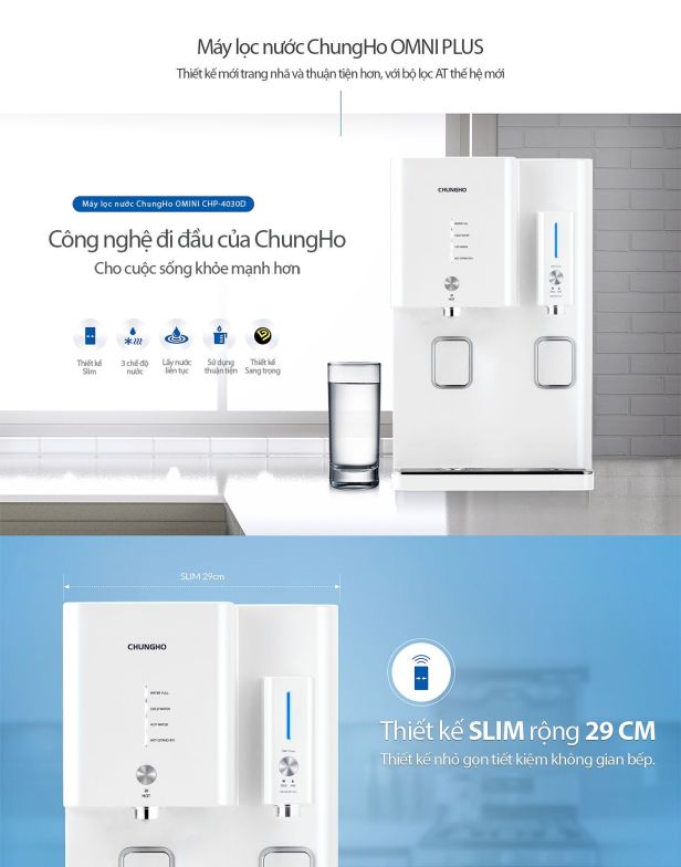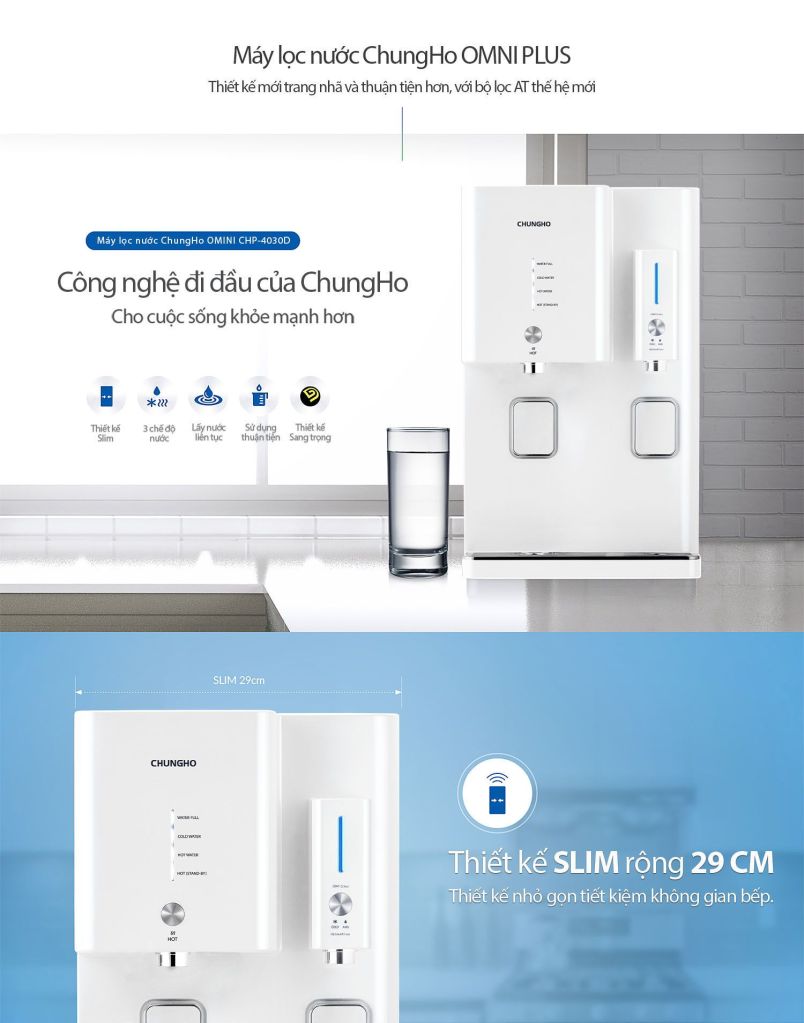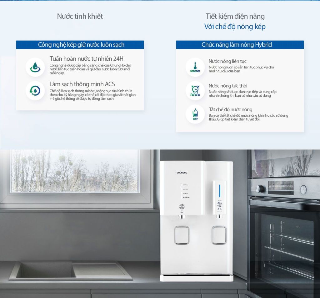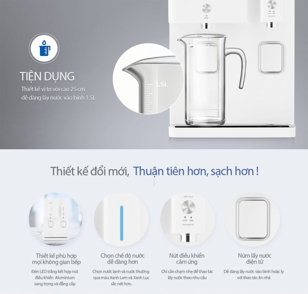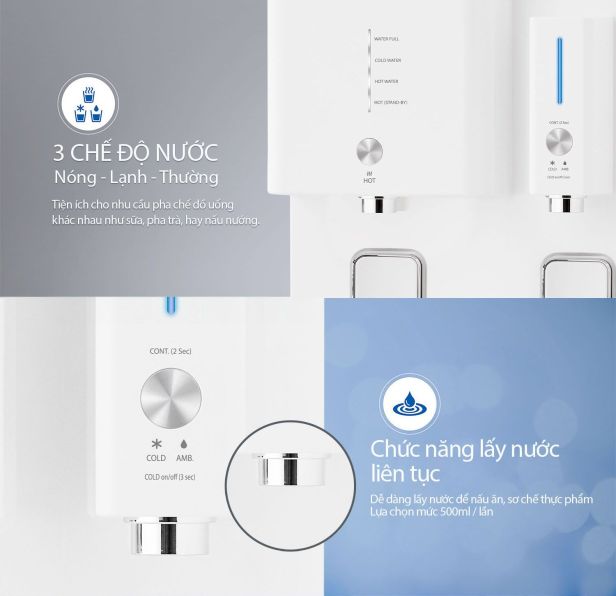 | Đặc điểm nổi bật: | .Điều khiển bằng cảm ứng hiện đại .Làm sạch thông minh (ACS) .Tuần hoàn nước tự nhiên 24h (NWPW) .Cảm biến mực nước quang học .Chức năng lấy nước liên tục .Chọn chế độ nước nóng: nước nóng sẵn, đun tức thời .Chế độ tắt nước lạnh, âm báo .Chế độ tắt nước nóng, tiết kiệm điện .Hệ thống làm nóng kép, tiết kiệm điện .Van tự khóa khi phát hiện rò rỉ nước .Cảnh báo an toàn bằng đèn LED và tiếng bíp .Dễ lắp đặt, thay thế lõi lọc |