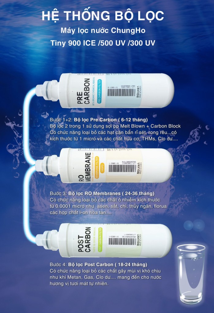 | Tổng số lõi lọc: | 3 lõi (tích hợp 4 cấp lọc) + đèn UV |