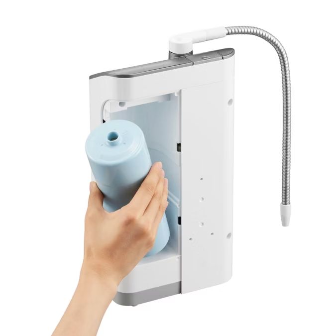 Tháo nắp từ phía sau của máy lọc nước ion kiềm, ấn xuống và kéo lõi lọc về phía bạn, sau đó nâng lên để gỡ ra. Làm theo trình tự ngược lại để lắp vào.