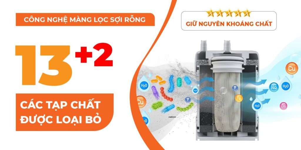 Sản phẩm sử dụng lõi lọc với công nghệ Màng lọc sợi rỗng tiên tiến của Nhật Bản, hiện là một trong những công nghệ lọc nước tiên tiến nhất hiện nay, giúp nước sau lọc trở nên sạch, vị ngon hơn do vẫn giữ được các khoáng chất tự nhiên có lợi cho sức khỏe. Lõi lọc được cấu tạo gồm 4 cấp lọc: