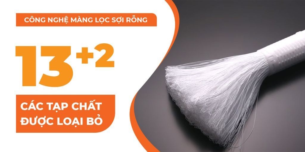 - Màng lọc sợi rỗng: loại bỏ các thành phần có hại trong nước với kích thước siêu nhỏ từ 0.1 micromet (0.0001 mm) trở lên như: vi khuẩn và các vi hạt khác, … Chỉ còn nước sạch và khoáng chất đi vào trong ống màng lọc với hàng triệu lỗ lọc ra ngoài.