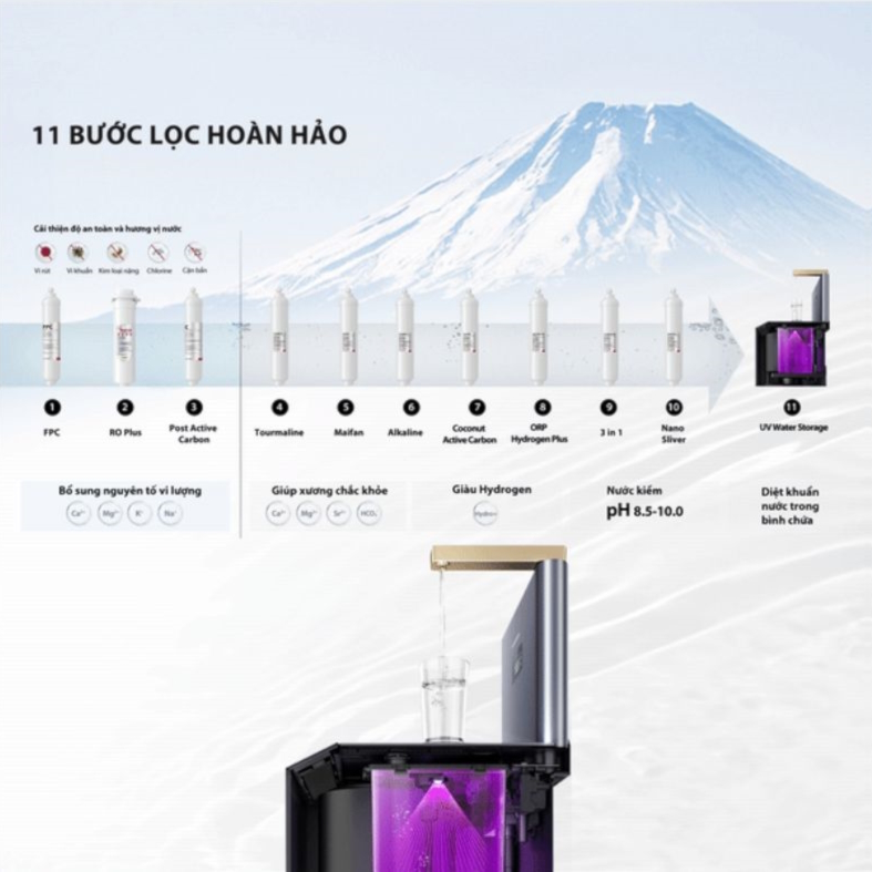 | Đặc điểm nổi bật: | .11 bước lọc, diệt sạch triệt để vi khuẩn .Công nghệ RO PLUS – bảo tồn khoáng chất tự nhiên .Công nghệ ROCK ACTIVATE – chiết xuất đá khoáng .Công nghệ UV LED – đèn diệt khuẩn bình chứa .Công nghệ lấy nước không chạm siêu tiện lợi .3 chế độ nước nóng – lạnh – nguội luôn sẵn sàng .TSmartLife – kết nối và điều khiển thông minh .Nút điều khiển cảm ứng .Màn hình LED hiển thị thông minh .Đèn báo nhắc thay lõi lọc nước .Cảm biến ánh sáng ECO .Cảm biến chống tràn – rò rỉ nước, chống quá nhiệt | ||