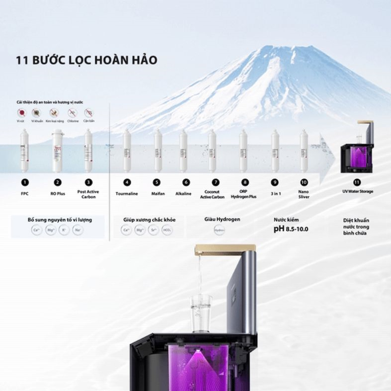 | Đặc điểm nổi bật: | .11 bước lọc, diệt sạch triệt để vi khuẩn .Công nghệ RO PLUS – bảo tồn khoáng chất tự nhiên .Công nghệ ROCK ACTIVATE – chiết xuất đá khoáng .Công nghệ UV LED – đèn diệt khuẩn bình chứa .Công nghệ lấy nước không chạm siêu tiện lợi .3 chế độ nước nóng – lạnh – nguội luôn sẵn sàng .TSmartLife – kết nối và điều khiển thông minh .Nút điều khiển cảm ứng .Tùy chỉnh nhiệt độ nước nóng .Màn hình LED hiển thị thông minh .Đèn báo nhắc thay lõi lọc nước .Cảm biến ánh sáng ECO .Cảm biến chống tràn – rò rỉ nước, chống quá nhiệt | ||